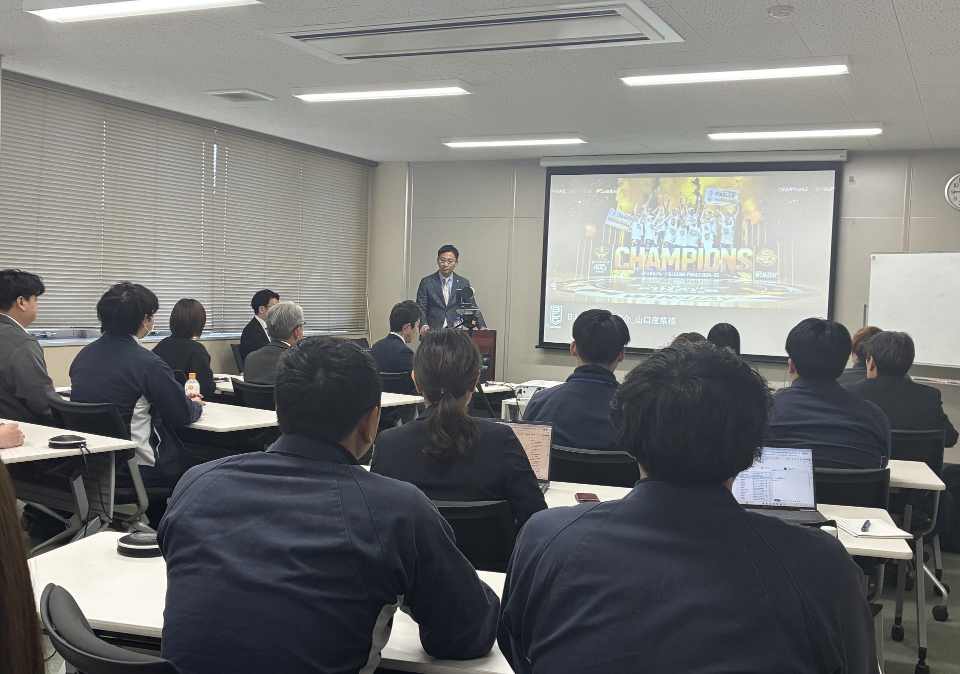 午後からは、山口産業本社にて社員向けの特別講演会を開催。B.LEAGUEが掲げるビジョンや「B.革新」の取り組みについての解説に加え、オーナー企業としてスポーツチームを支える意義や、その社会的役割についてお話をいただきました。